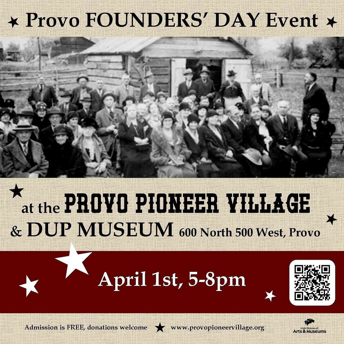 If you've ever driven past the Pioneer Village or DUP Museum and wondered what's inside then now is your chance to find out! Admission is FREE, donations welcome. There is additional parking at the Provo Recreation Center (320 W 500 N, Provo) and Timpanogos Elementary School (449 N 500 W, Provo). Bring the family, bring a neighbor, and come ready for a real good time! We can't wait to see you there. See you April 1st! More details at: www.provopioneervillage.org
