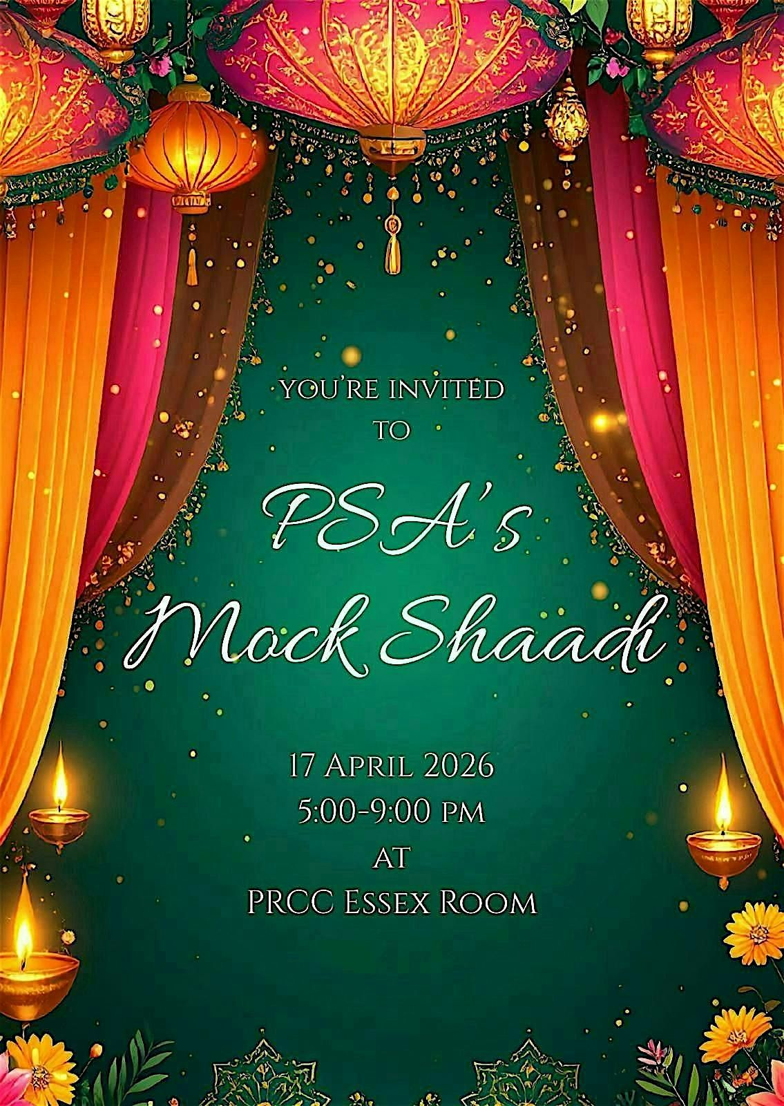 Join us in person for an epic day full of fun, laughter, and some desi shaadi vibes! Whether you're here for the drama or just to chill with friends, PSA Mock Shaadi promises a memorable experience that'll keep you buzzing. Don't miss out on the crazy games, awesome decor, and all the masti! It's gonna be a blast — see you there!