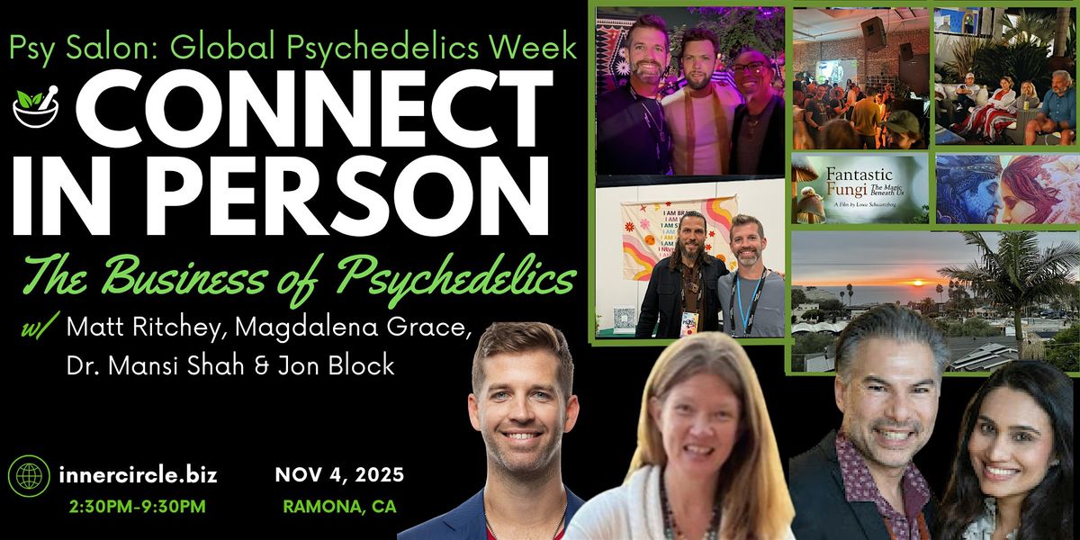 on November 4th 2:30pm-9:30pm in Ramona, CA (Location Given Upon Registriation) w/ CEO MATT RITCHEY, DR. MANSI SHAH & JON BLOCK and MAGDALENA GRACE for a meaningful and elevated conversation about the Business of Psychedelics.