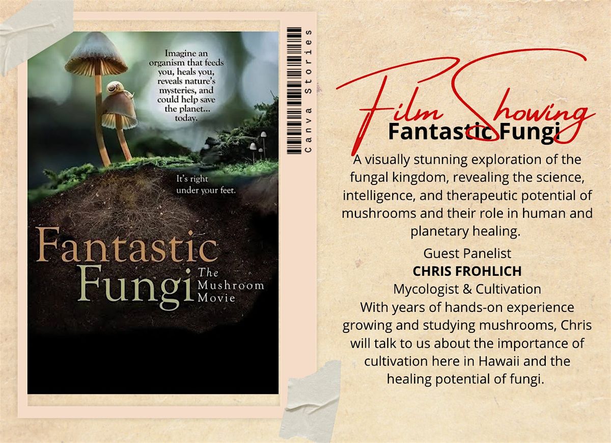 Following the film, we are honored to welcome a special guest speaker from our local Hawaiʻi community who will share insights on mushroom cultivation in Hawaiʻi, including the unique environmental conditions of the islands, sustainable growing practices, and the role fungi can play in wellness, education, and community resilience.