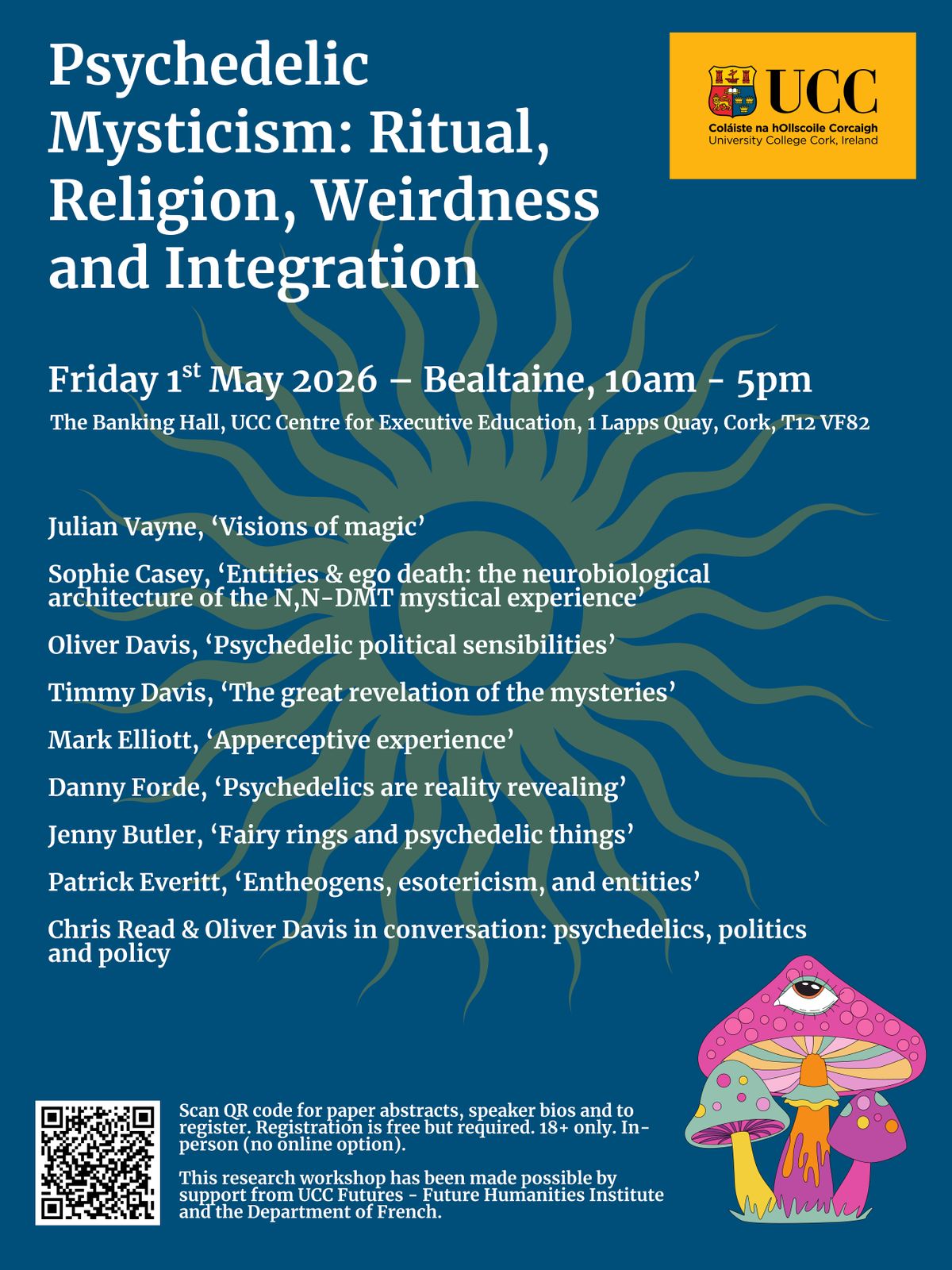 This one-day research workshop will bring into conversation a selection of international experts from different backgrounds, to make an original contribution to the emerging field of the psychedelic humanities. The conversation will be focused around mysticism, spiritual exercises and ‘weirdness’ (Erik Davis, 2019) and will explore the difficulties which users of psychedelics have in understanding mystical, religious, spiritual or simply weird sexual and other experiences occasioned by psychedelics. Mysticism is usually rather grudgingly acknowledged to be a significant facet of psychedelic experience by many of the biomedical researchers pioneering the ongoing ‘psychedelic renaissance’ – the rediscovery of the potential of these substances to treat a wide range of the world’s most costly mental health problems. Indeed, it has long been acknowledged that psychedelic experiences which involve a mystical dimension are correlated with better treatment outcomes. Nevertheless, many biomedical researchers today seek to downplay the mystical dimension, assuming that this is a prerequisite for social and regulatory acceptance of psychedelics as medicines. This workshop, timed to coincide with Bealtaine, aims to show instead why psychedelic encounters with mysticism should instead be prized, while also welcoming critical voices and opposing views.