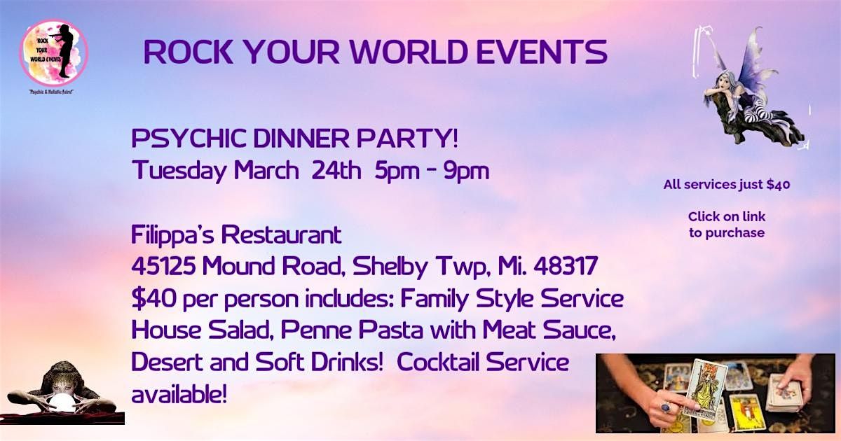 Join us for a fun psychic dinner party at Filippa's Restaurant! Dinner is served family style and includes: salad, penne pasta with meat sauce, soft drinks or coffee plus dessert! Your $40 ticket includes dinner and a gift at the door! Also get a free ticket for prizes! Readings are available at $40 each and paid directly to the reader. There is also shopping for crystals and jewelry.