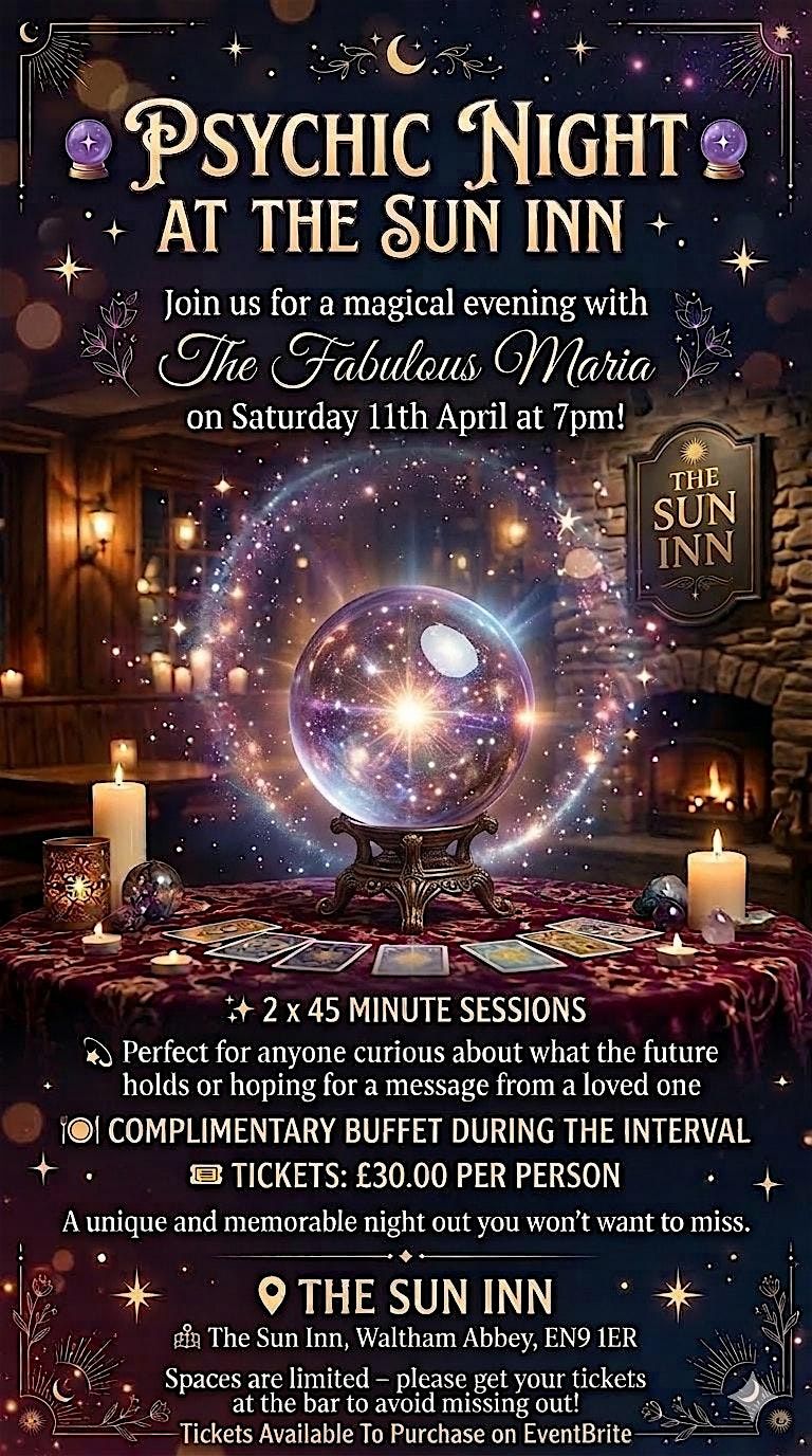 Info: A Magical Intimate Evening Perfect For Anyone Curious about the Future or Hoping for a Special Message from a Loved One. Ticket Info:- x2 45mins Sessions: Tasty Buffet During Interval!