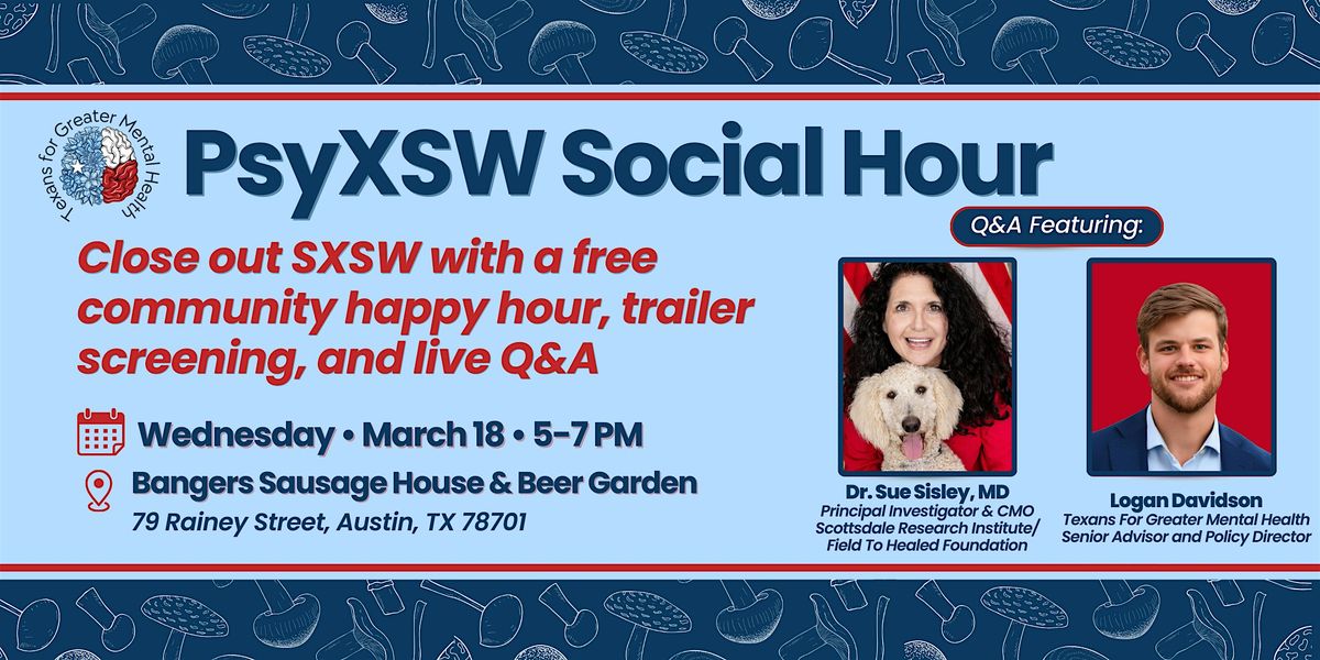 Join Texans for Greater Mental Health at Banger's Sausage House & Beer Garden Basement to connect with others in the psychedelic research and advocacy community, and attend a trailer preview and live Q&A with Dr. Sue Sisley, MD, and Logan Davidson, leaders in advancing psychedelic research and policy efforts nationwide.