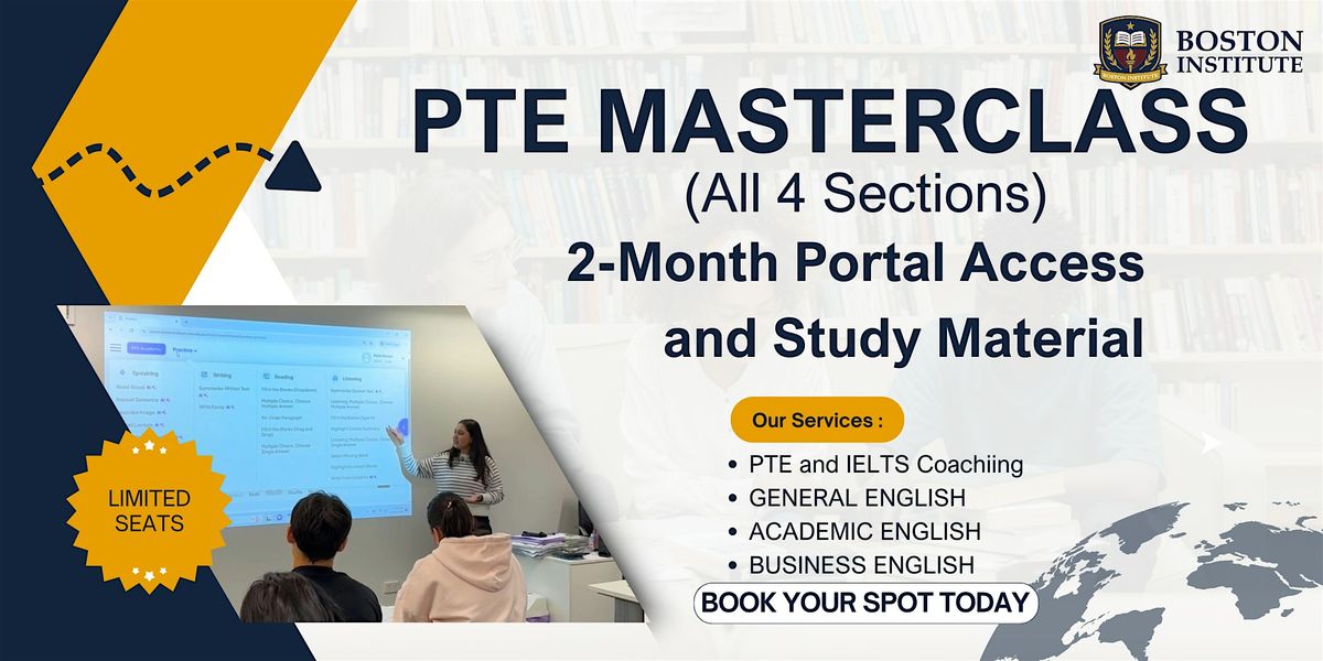 Ready to ace your PTE exam? Join our in-person masterclass covering all four sections with expert tips and tricks. Plus, get exclusive access to our portal for 2 months and comprehensive study material to boost your prep anytime, anywhere. Donโt miss out on this chance to level up your skills and conquer the test with confidence!