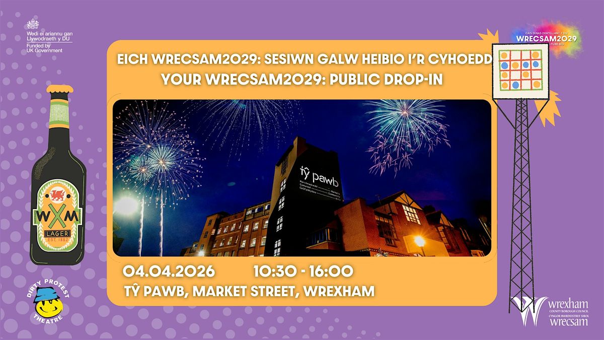 Mae Dirty Protest Theatre yn cynnal ymgynghoriad galw heibio cyhoeddus hamddenol ar gyfer Cais Dinas Diwylliant y DU Wrecsam2029. Dewch am sgwrs fer neu arhoswch yn hirach a rhannwch yr hyn yr hoffech ei weld yn cael ei ddathlu, ei gefnogi a'i amlygu mewn blwyddyn o ddiwylliant i Wrecsam.