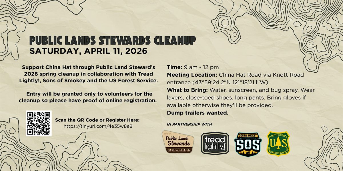 Support China Hat through Public Land Steward’s 2026 spring cleanup in collaboration with Tread Lightly!, Sons of Smokey and the US Forest Service.