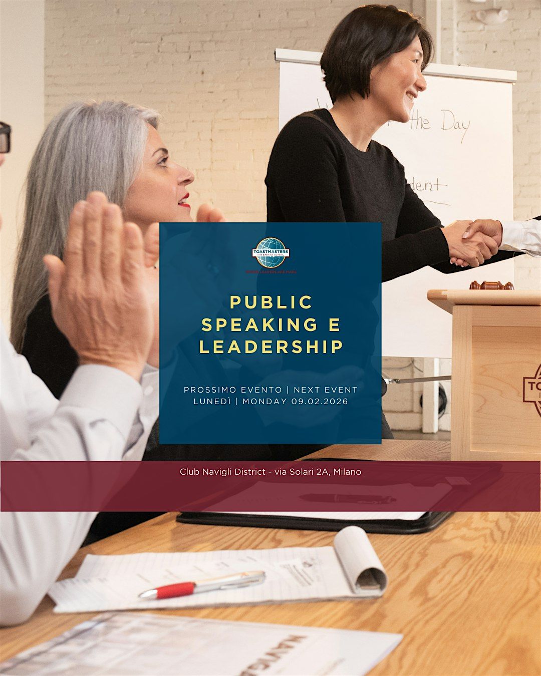 Join the public speaking talents of the Toastmasters Navigli club and improve your communication effectiveness and Leadership skills, in an open and friendly environment!