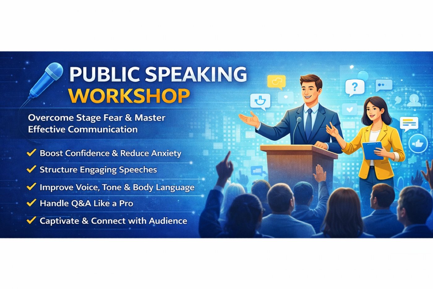 The Public Speaking Workshop is an interactive and confidence-building session designed to help participants overcome stage fear and communicate effectively in professional and personal settings. This workshop focuses on practical techniques to improve clarity, body language, voice modulation, and audience engagement.