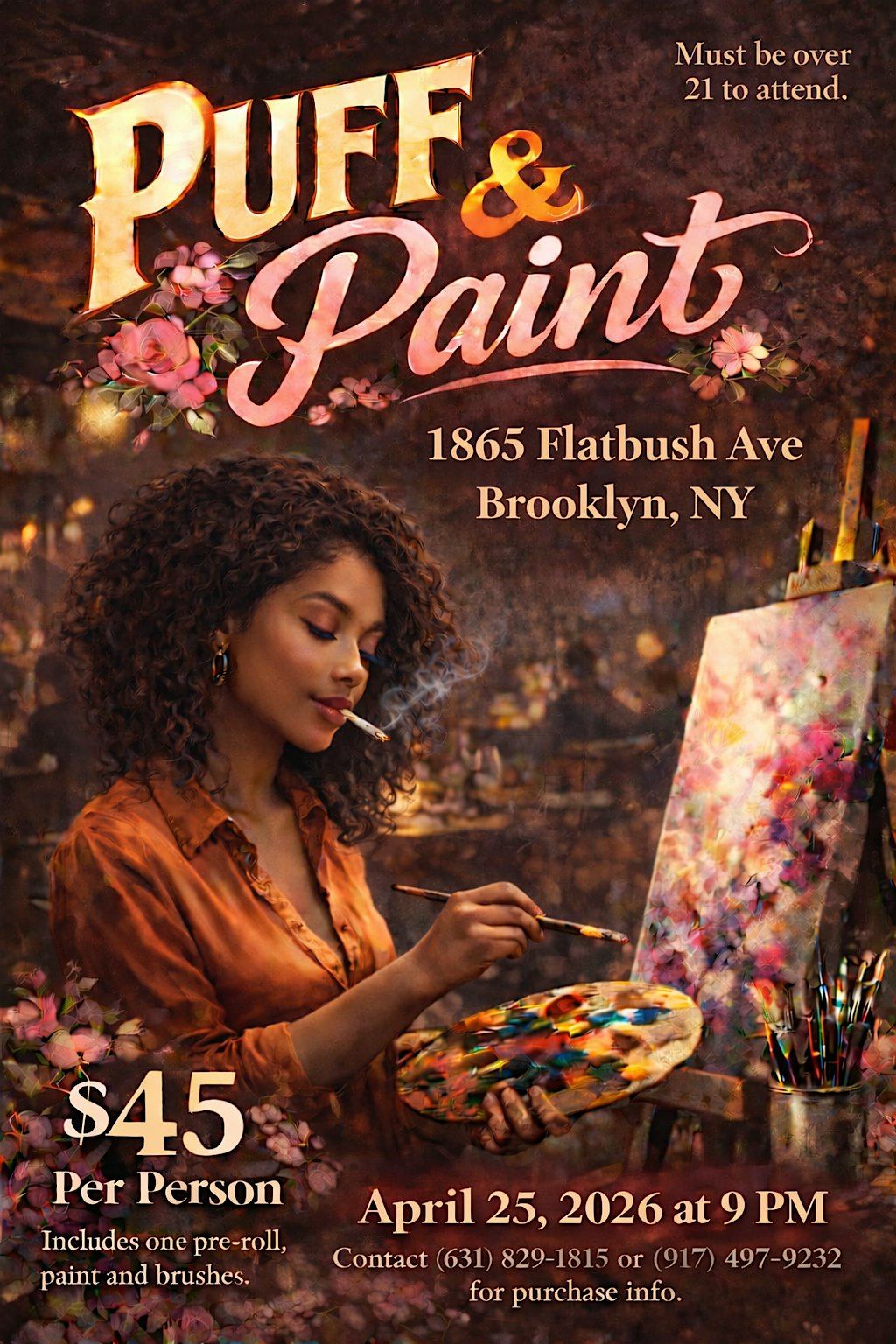 Get ready for a chill and creative time with Puff and Paint! This in-person event is all about relaxing vibes, great company, and letting your artistic side shine. Whether you're a pro or just want to have fun with some colors, this is the spot for you. Bring your friends, grab a brush, and let's make some cool art together. Don’t miss out on the fun, laughter, and creativity flowing all around. See you there!