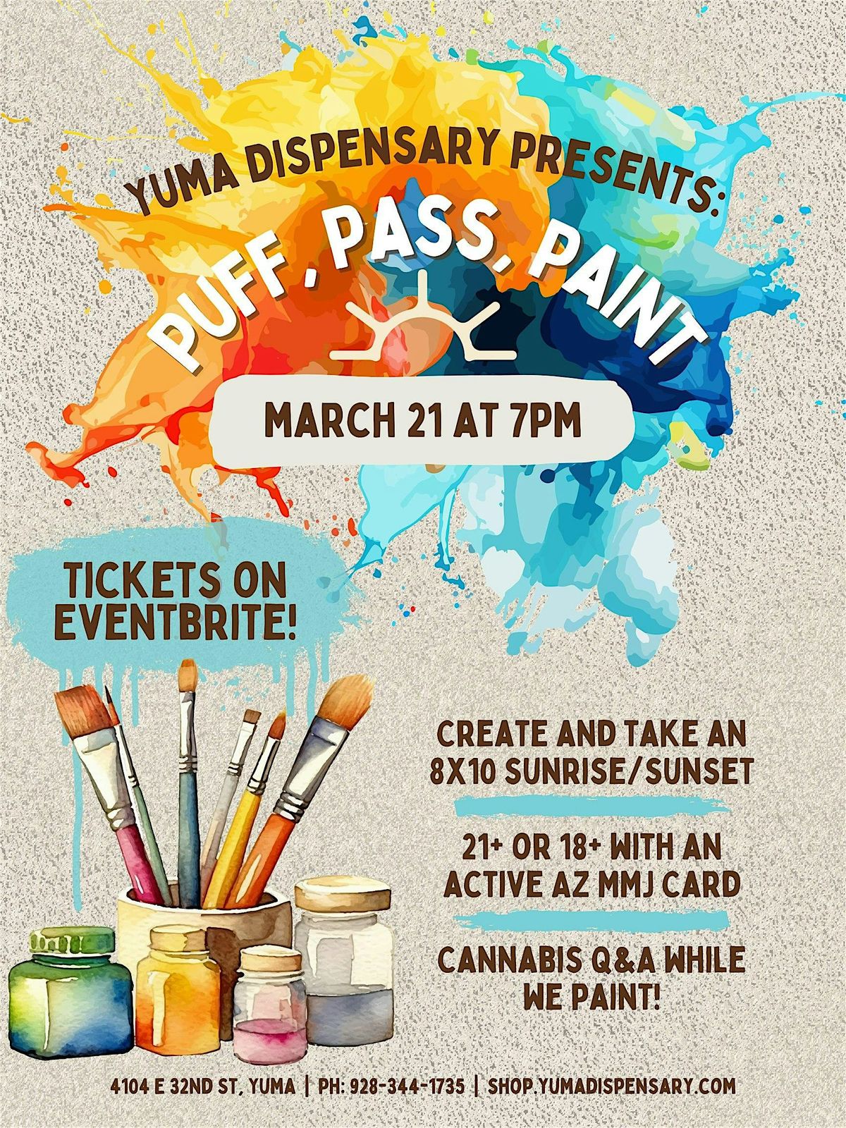 Join us at the YUMA Dispensary WAREHOUSE for a chill night of creativity and good vibes! On March 21, 2026 at 7:00 PM (MST), we'll be mixing painting with some laid-back fun. Whether you're a pro or just want to relax and create, this event is perfect for you. We'll provide an 8"x10" canvas, paints, brushes and help you create your choice of an AZ sunset or sunrise. Bring your friends, your creativity, and get ready to puff, pass, and paint the night away!