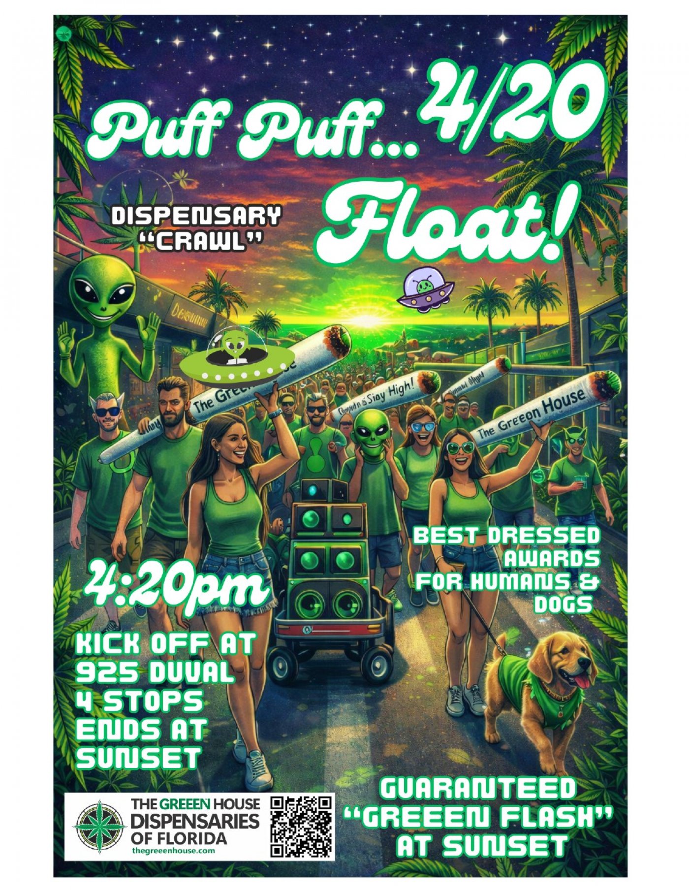 We're celebrating 4/20 with a bud crawl! Meet at the Smallest Dispensary at 925 Duval Street Key West next to Sushi Song as we light up the streets with a high-vibe walking party featuring inflatable joints, aliens in the wild, and a rolling mobile DJ bringing the beats.