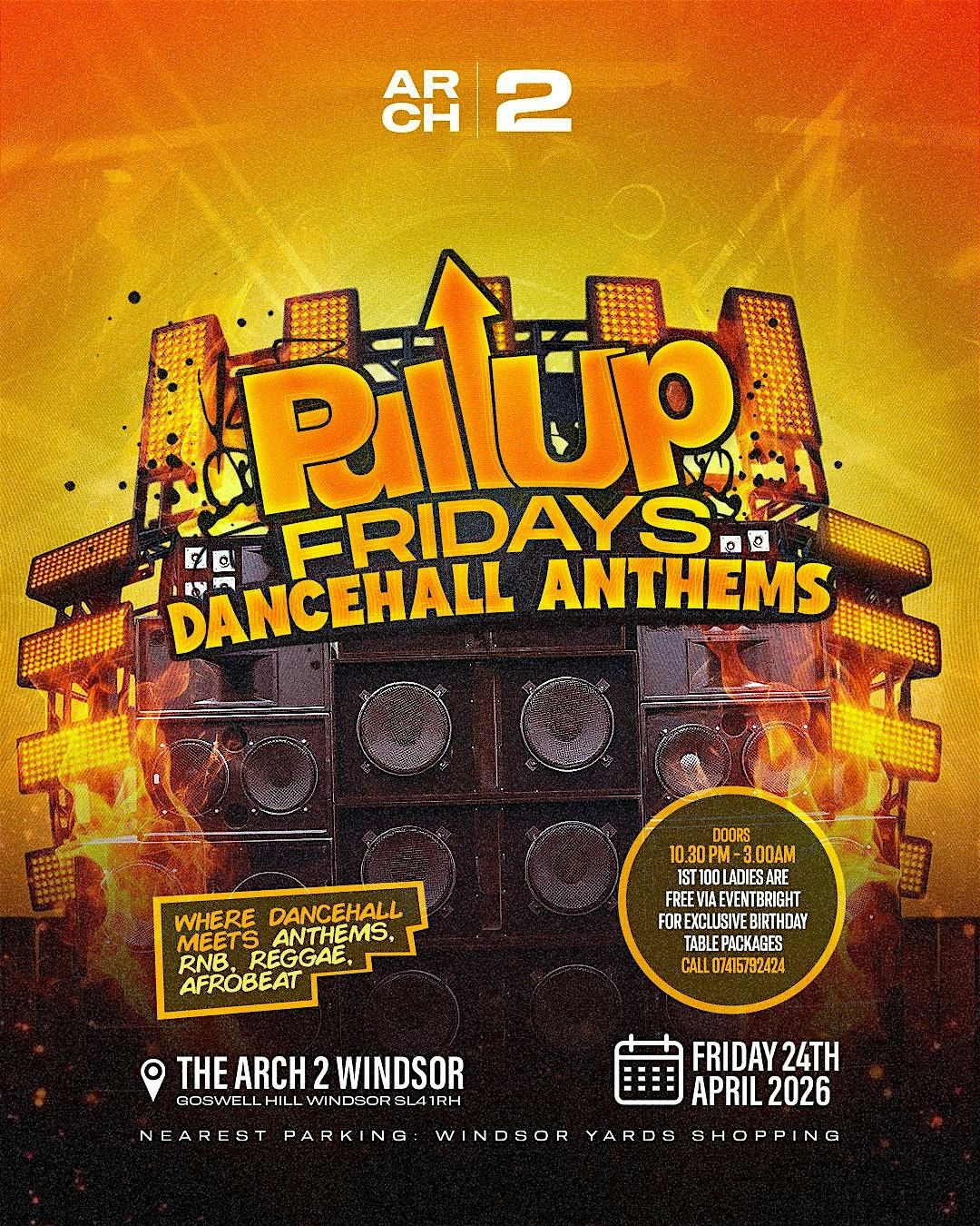 Pull Up Friday's London Biggest Dancehall Bashment party lands at Arch 2 Windsor Friday 24th April. The 1st 100 Ladies claim a free ticket.If You Love Your Vybz Kartel, Popcaan, Beenie Man, Spice, Alkaline, Buju Banton, Beres Hammond, Sanchez And Tracks That Gets An Automatic Pull Up!!!!...Make Sure You're In The House.. Pull Up Fridays @Arch2 Windsor Friday 24th April 2016 Pull Up FridaysArch2 Windsor