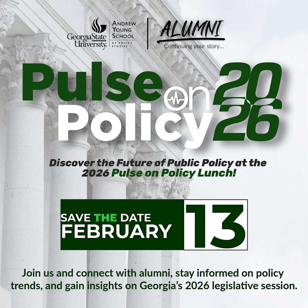 Enjoy a lunch packed with thought-provoking public policy discussions, insights from the public policy terrain in Georgia, and network with other alumni.