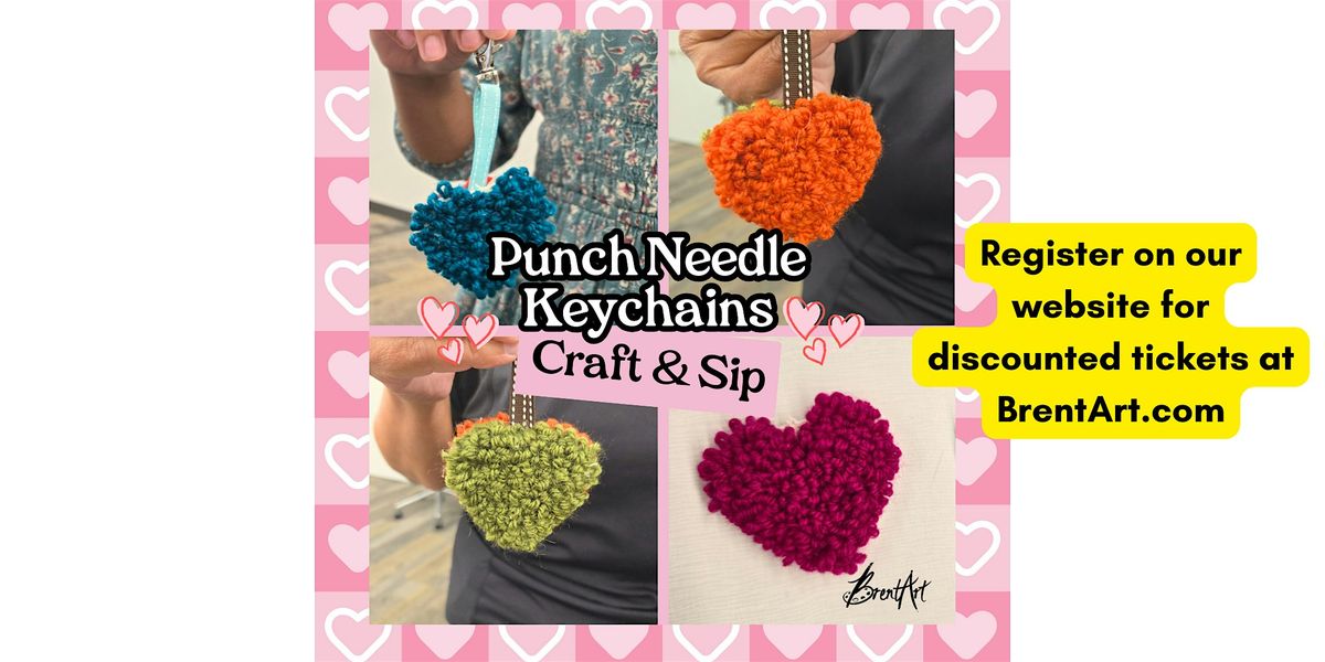 ✨ Join us for a beginners Punch Needle Keychains Craft & Sip, a guided art experience where you’ll learn how to embroider with yarn to create heart-shaped keychains with all materials provided.