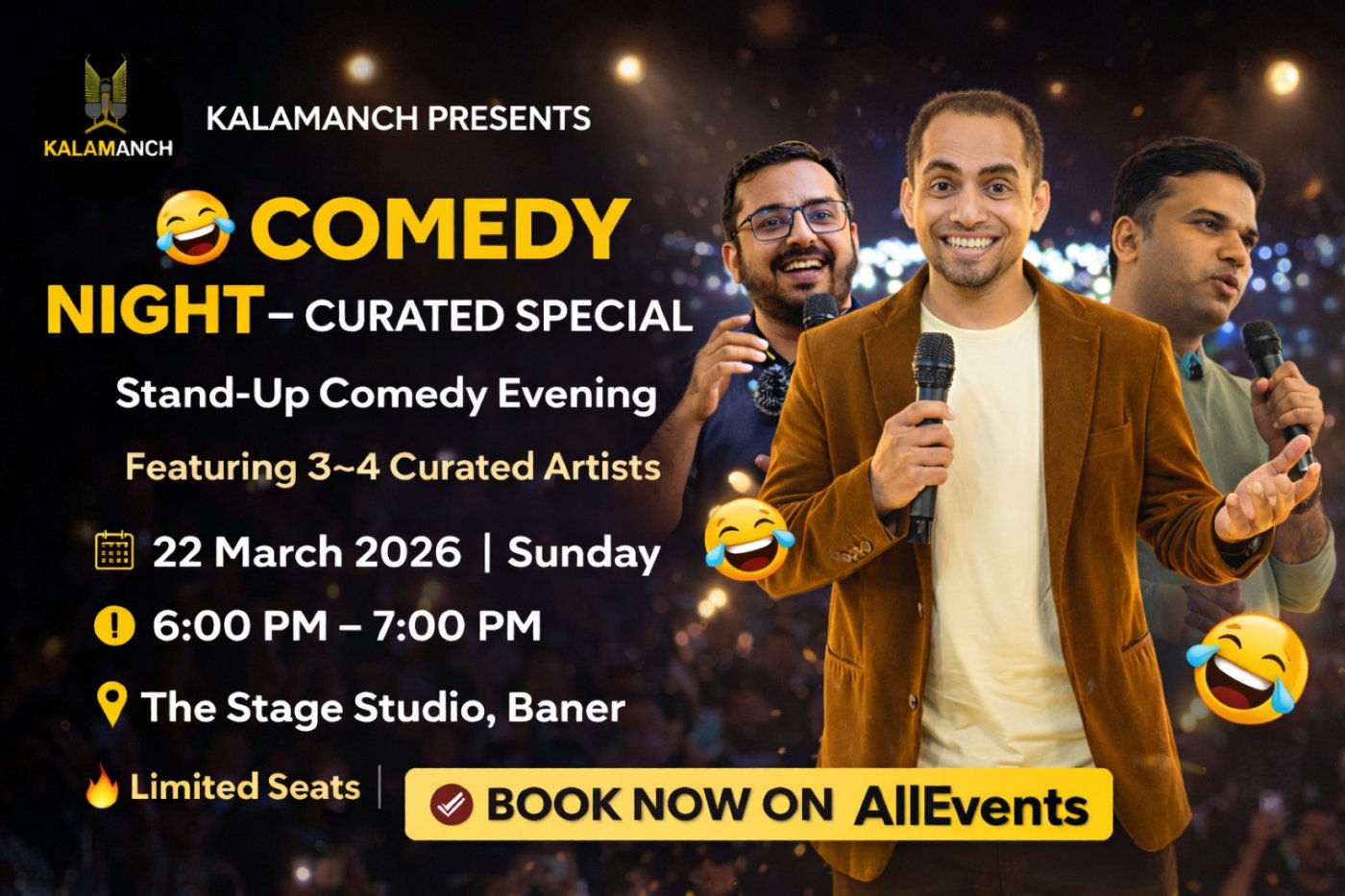 Limited seats available. Book early and grab your spot for an evening full of laughs!