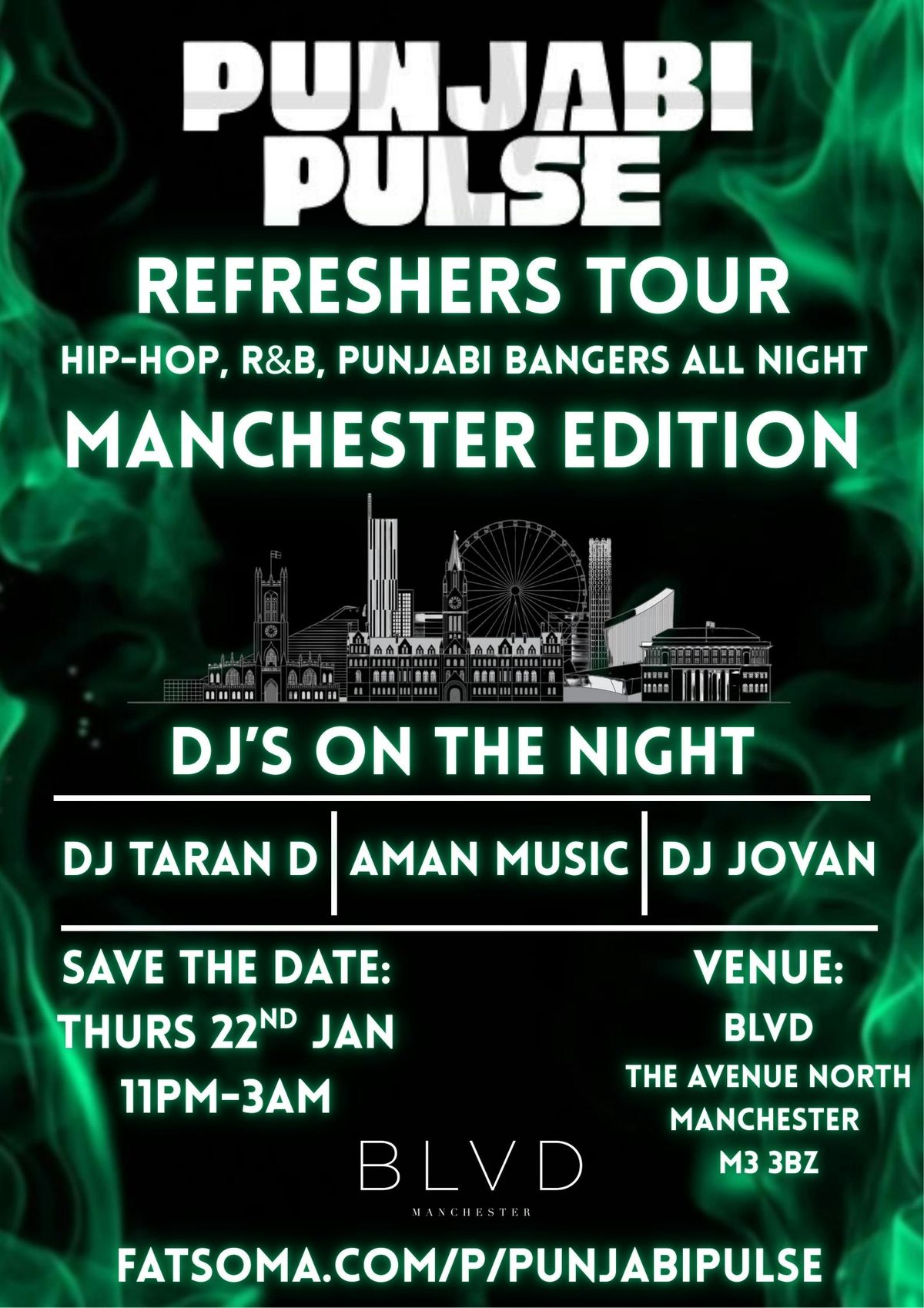 Punjabi Pulse Refreshers Tour 🌟Night 1 We Are Back In Manchester 🔥Student Refreshers Tour 📚Punjabi Pulse Presents to you a Manchester Refreshers Special at BLVD Manchester🎵DJ’s on the Night:DJ Taran DAman MusicDJ Jovan🗓️Thursday 22nd January 2026📍BLVD Manchester, The Avenue, North, Manchester M3 3BZ⏰11:00PM-3:00AMLast Entry: 1:00AM⭐️Don’t miss out on the midweek madness. Gather your friends and make it a night to remember!💃No sports wear, caps, heavily branded clothing are permitted🚨All guests must be 18 years of age or aboveAll guests must be able to present an Official Hard Copy ID that stipulates their date of birth Photocopies, photos, college or university cards will not be accepted as official ID‼️Any guest who behaves in a disorderly manner and is disrespectful to guests or staff will be asked to leave the venue Tickets Available on Fatsoma 🎟️Disclaimer: