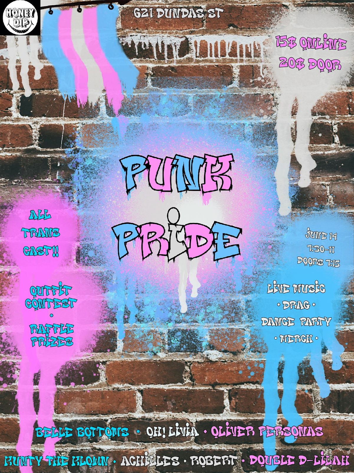 Drag performances from Kunty the Klown, Belle Bottoms, Achilles, Double D-Lilah, Oliver Personas, and Oh! Livia