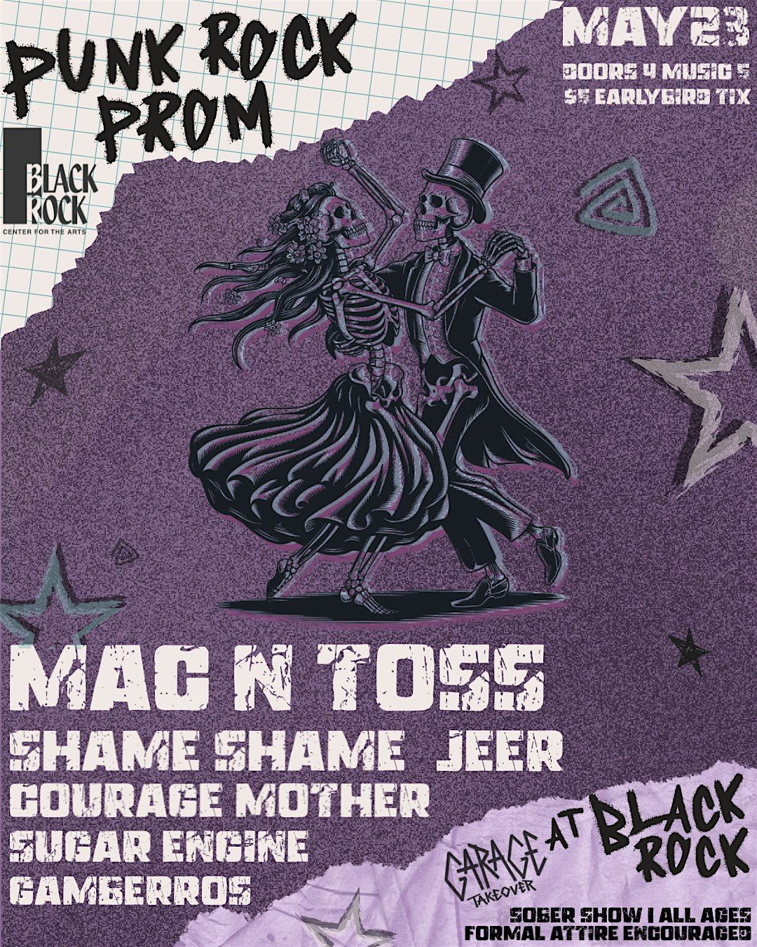 The Garage takes over BlackRock Center for the Arts for “Punk Rock Prom!” A fundraiser for local nonprofit Girls Rock! DC. This organization encourages queer/femme youth to get involved in the local music and arts scene through summer camps, classes, and performance opportunities. For this event we’ll be showcasing a handful of the DMV’s up and coming femme fronted punk bands: Mac N Toss, Courage Mother, shame shame, JEER, Sugar Engine, and Gamberros. We invite you all to Germantown, MD, in your finest attire to help us raise money for a good cause while creating a space in our community for all ages to come out and express themselves through music!