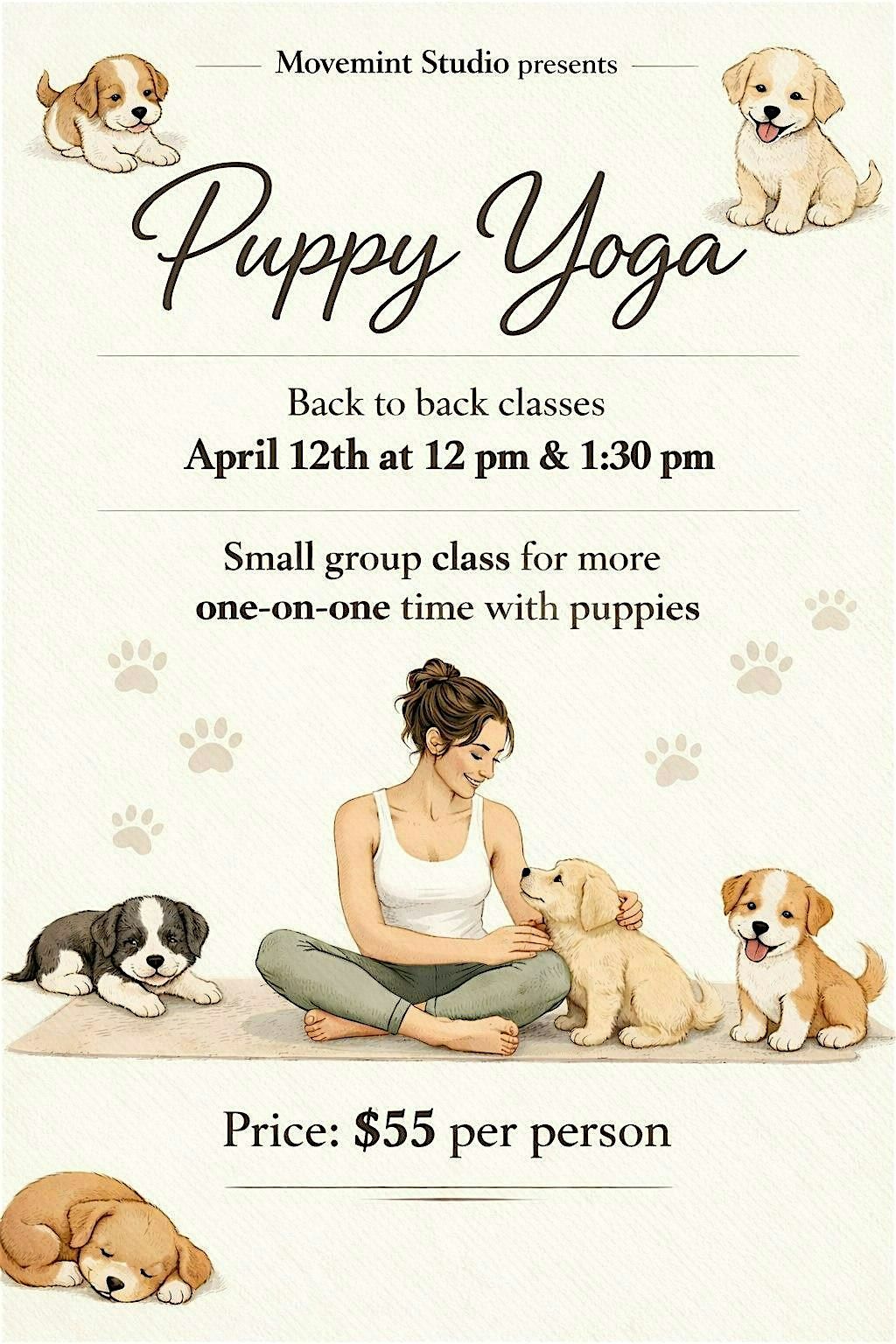 Two intimate Puppy Yoga classes, held back to back at 12:00 PM and 1:30 PM. Please arrive 10 minutes early, as class will begin right on time. You will have to choose a time slot (12:00 PM or 1:30 PM). Once you pick a time slow it cannot be changed.