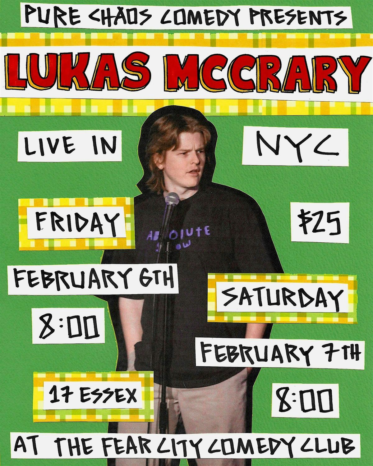 Produced by: Breck Gordon & PURE CHAOS COMEDY - A Friday Night with Lukas McCrary at THE FEAR CITY COMEDY CLUBAbout this Event