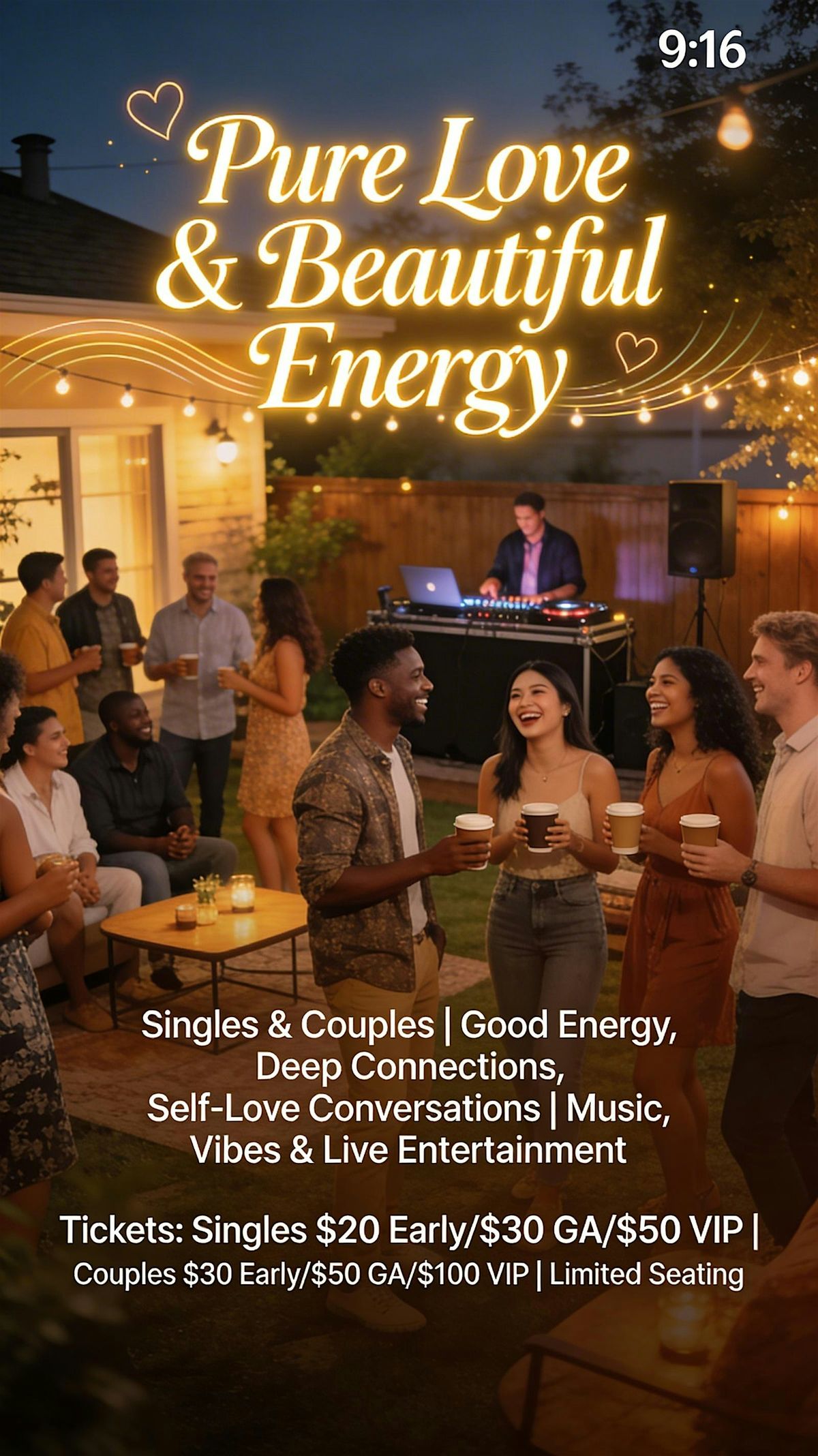 Pure Love & Beautiful Energy is a curated evening experience for singles and couples who are ready for good vibes, meaningful connections, and conversations that actually move the needle in love and in self-love.
