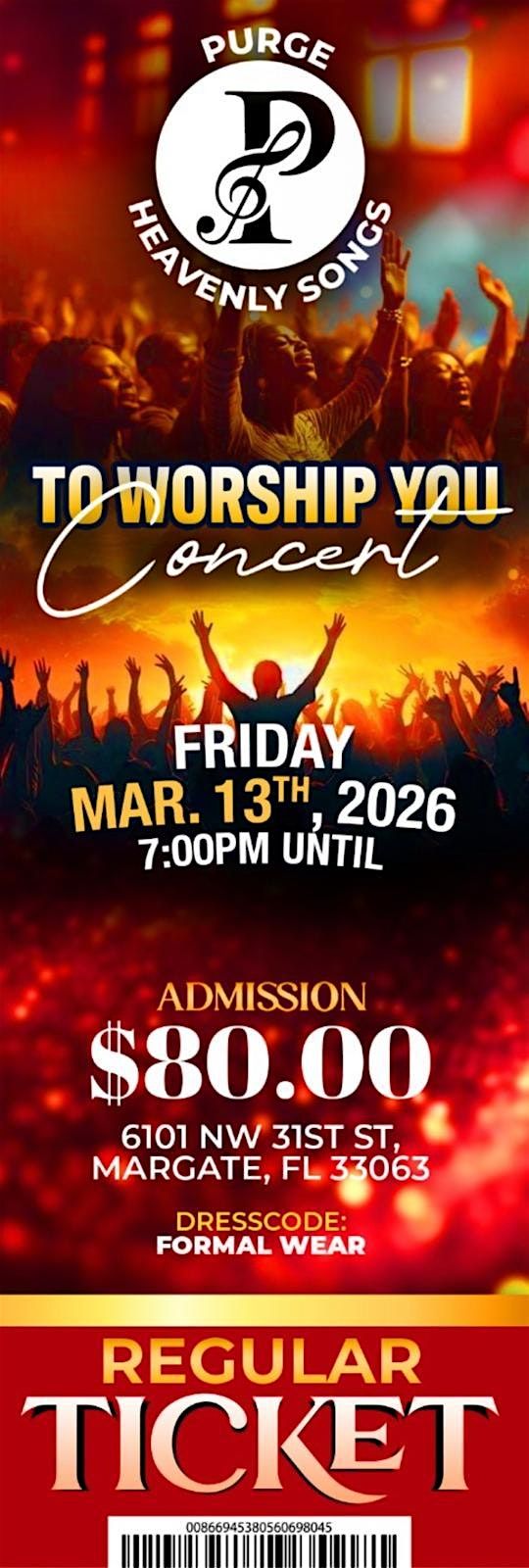 Purge Heavenly Songs presents To Worship You Concert. Friday, March 13th, 2026. starts 7pm -until. Dresscode: Formal.