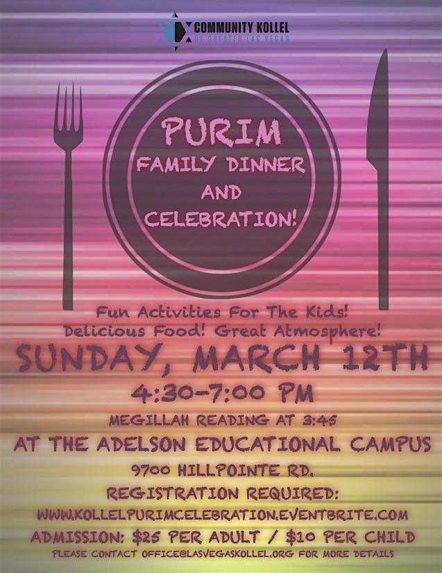 Join Kollel for a fantastic Purim Family Dinner and Celebration! Delicious Food! Great Atmosphere!