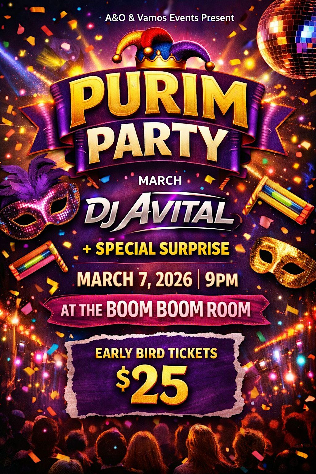 Come join us for an epic in-person celebration filled with fun, laughter, and great vibes. Dress up in your craziest costumes, enjoy, and dance the night away. It's all about good times with friends and making awesome memories. Don’t miss out on the Purim Party—where the fun never stops!