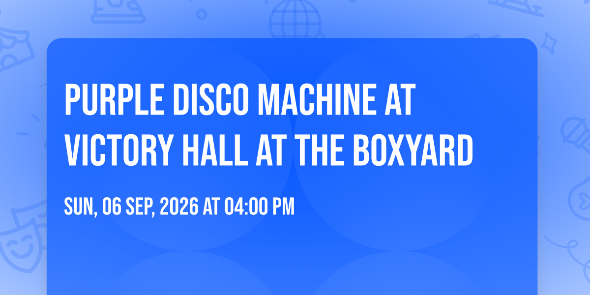 🎉 Welcome to Purple Disco Machine at Victory Hall at The Boxyard, where the impossible becomes possible and dreams take flight! 🏛️ Join us at Victory Hall at The Boxyard in the heart of Seattle, WA for an event that will redefine your expectations. 📅 On September 6th, 2026 at 04:00 PM, witness the transformation of space and time into something truly magical. ✨ It's a curated experience combining the best of innovation, entertainment, and community spirit, creating moments that will be remembered for years to come. Whether you're a first-time visitor or a seasoned enthusiast, prepare to be amazed. 🎊 Book now to ensure your place in this unforgettable experience!