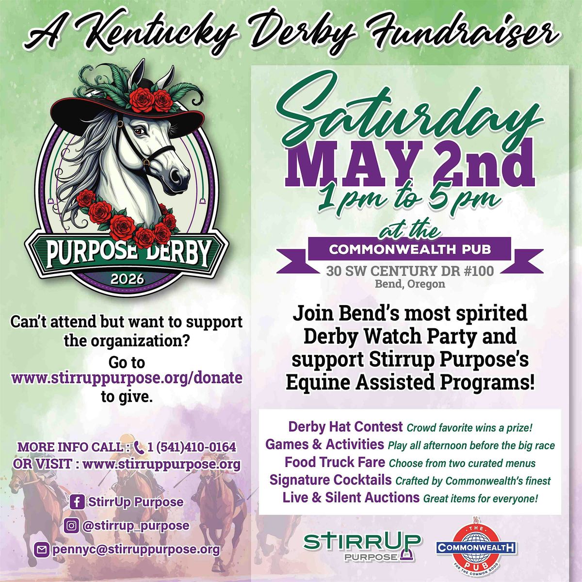 Come be a part of the Purpose Derby, Bend’s most spirited Kentucky Derby watch party supporting StirrUp Purpose—a local nonprofit organization dedicated to providing purpose and healing through therapeutic and adaptive riding and equine programs for children and adults with disabilities, veterans, first responders and individuals experiencing homelessness.