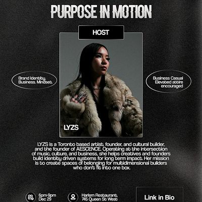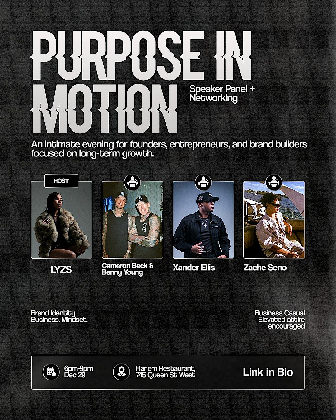 Purpose in Motion is a speaker panel and curated networking experience designed for founders, entrepreneurs, and multidimensional creatives who are building with intention.