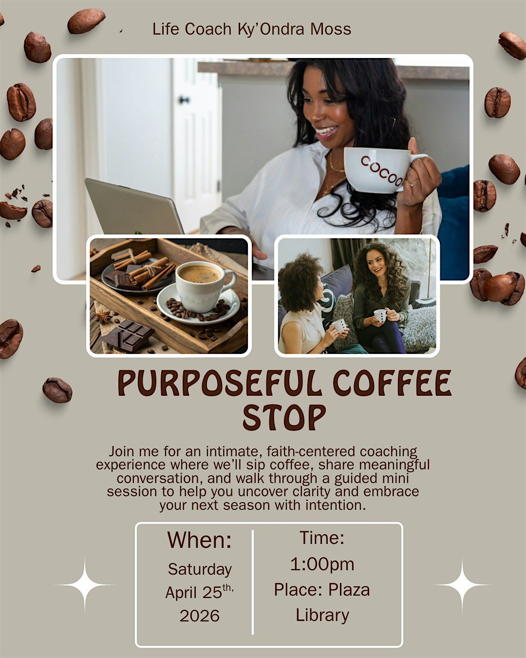 Join me for an intimate, faith-centered coaching experience where we’ll sip coffee and tea, enjoy light refreshments, and walk through a guided mini coaching session designed to support your next season.