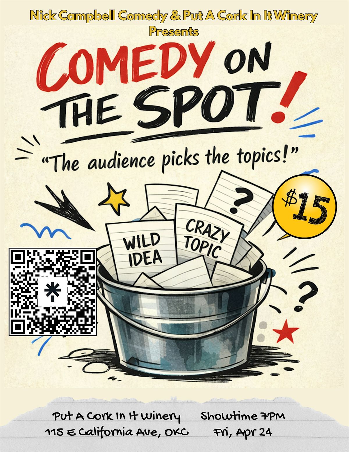 Come out to Put a Cork in It Winery in Bricktown for a one-of-a-kind night of stand-up comedy where the comics don’t come with a set list—the topics come from YOU, the audience! It’s spontaneous, unpredictable, and hilarious every time.