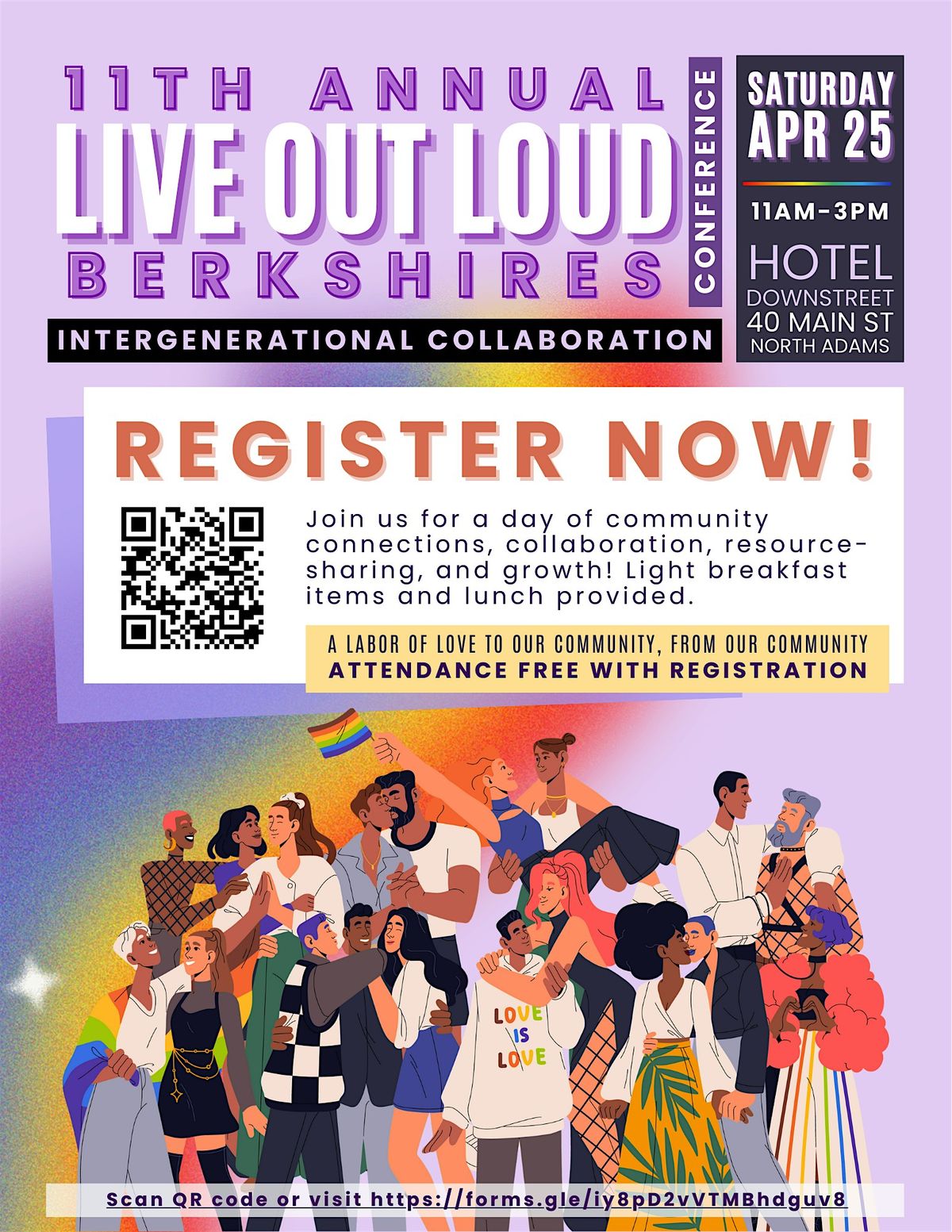 The 11th annual Live Out Loud Berkshires Conference will bring LGBTQ people and allies from all over the Berkshires together on Saturday, April 25, 2026, from 11:00 AM - 3:00 PM at Hotel Downstreet (40 Main St, North Adams, MA 01247) to celebrate growing intergenerational collaboration and new community initiatives in challenging times.