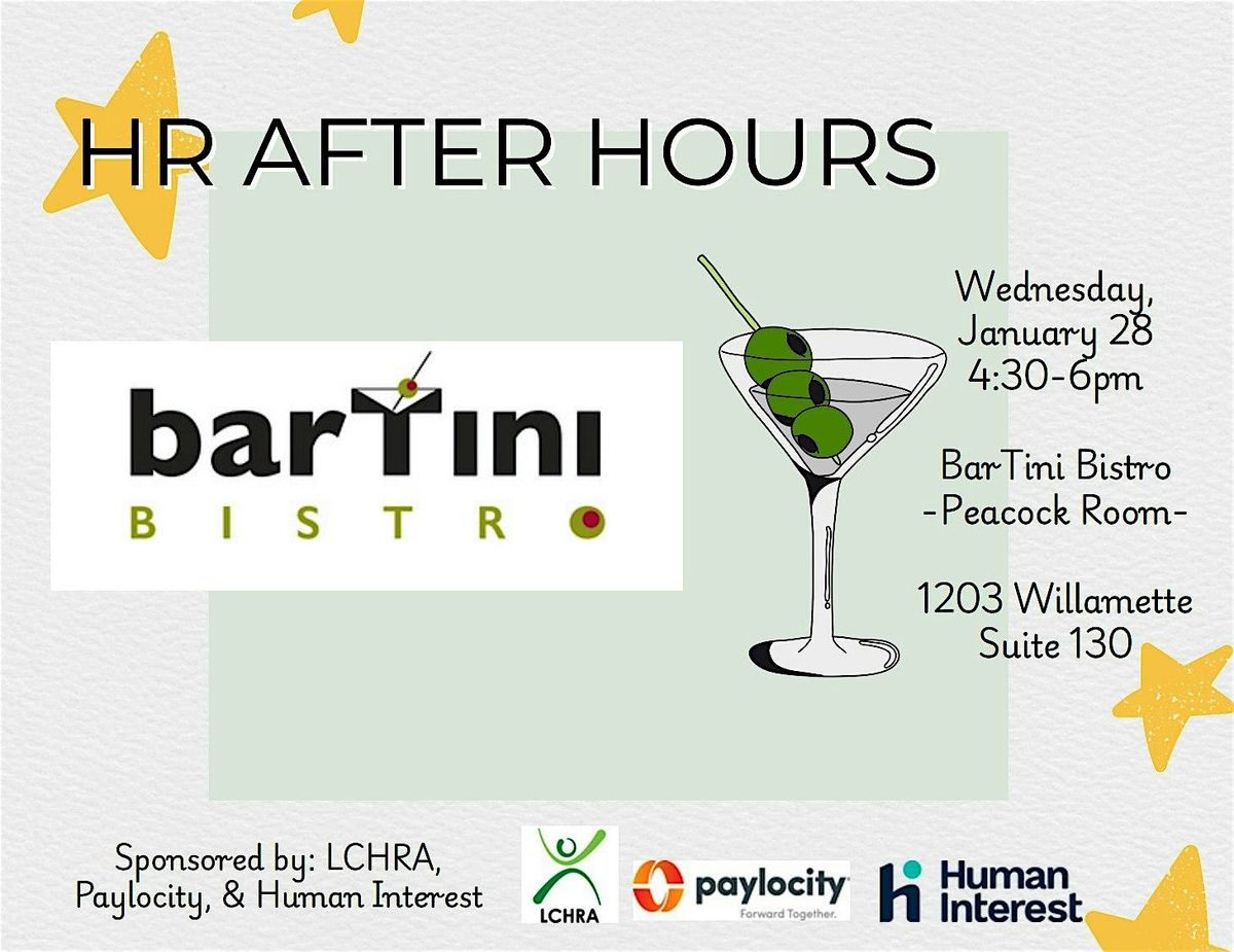 Join LCHRA for our FIRST HR After Hours of 2026! Register now to join the fun on Wednesday, 1/28/26 from 4:30-6 pm at barTini bistro (in the Peacock Room) in Eugene. This complimentary networking event is a great way to meet other HR professionals, your next boss or next team member! Thank you to our co-sponsors, Human Interest & Paylocity, for their continued support of this event!
