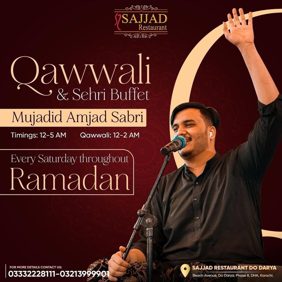 Experience the enchanting melodies of Qawwali by Mujadid Amjad Sabri at Sajjad Restaurant’s Sehri Buffet every Saturday during Ramadan from 12-2 AM!.
