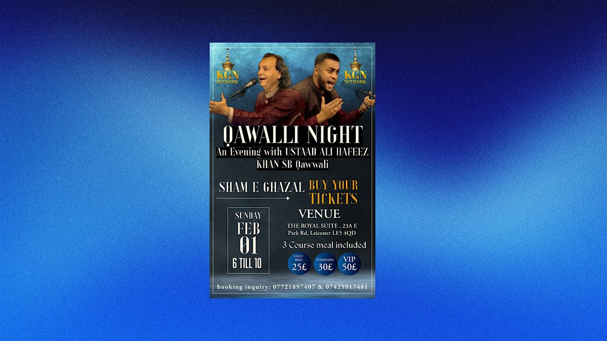 Experience a soulful Qawwali Night with Ustaad Ali Hafeez Khan Sb at Sham-e-Ghazal, featuring live music, devotion, and a 3-course meal .