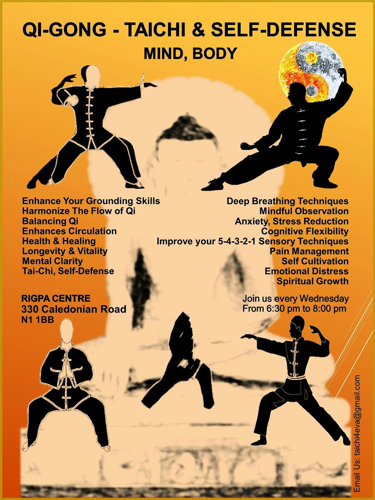 Welcome to the Qi-GONG, TAICHI & SELF-DEFENSE event. Join us every Wednesday for an evening of relaxation and empowerment. Unleash your inner strength through ancient practices of Qi-Gong and Taichi, and learn valuable self-defense techniques to boost your confidence. This event is perfect for beginners and experienced practitioners alike. Come rejuvenate your mind, body, and spirit in a welcoming and supportive environment. See you there!