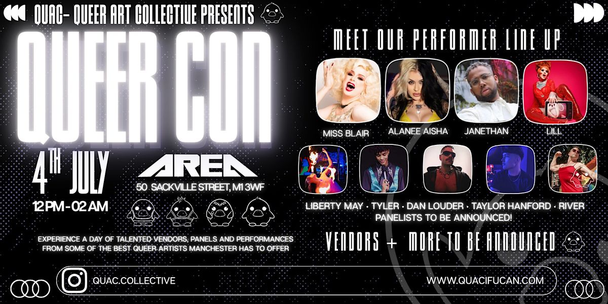 Join QuAC (Queer Art Community) for its inaugural event, Queer Con, a full-day, multidisciplinary celebration dedicated to showcasing the immense, often overlooked, talent within Manchester's LGBTQ+ creative scene. Our mission is to create an inclusive and accessible platform for emerging queer artists, performers, and voices.