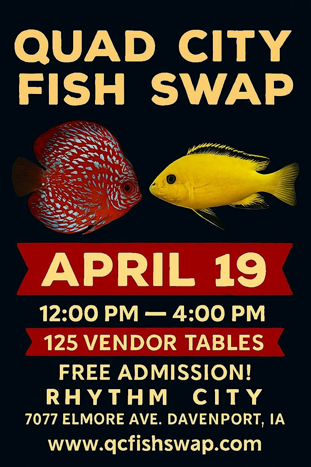 The Quad City Fish Swap returns to Rhythm City on April 19 for a one‑day event featuring freshwater fish, plants, invertebrates, and aquatics vendors from across the Midwest. Doors are open Noon–4 PM, and admission is free. Great for beginners and experienced hobbyists looking to stock up before summer. Full details at qcfishswap.com.