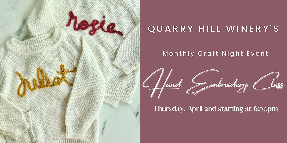 Join us at Quarry Hill Winery for our monthly craft night the first Thursday of the month. In April we will be hosting a beginners hand embroidery class. Each person will be hand embroidering on their own sweater.