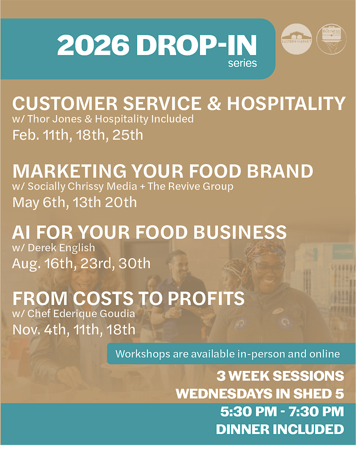 The Quarterly Drop-In Series is a free, three-week workshop series designed for food entrepreneurs, caterers, restaurateurs, farmers, and food brands who want to strengthen their operations and prepare for what’s next.
