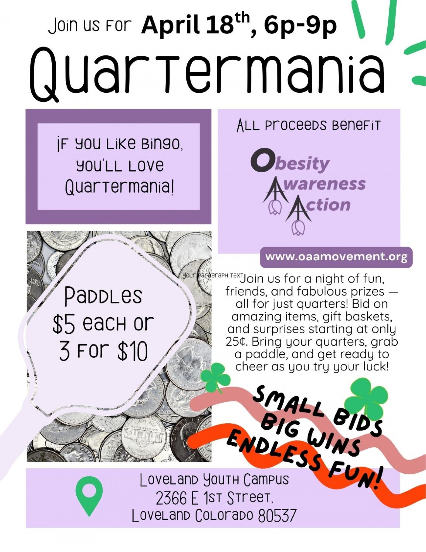 If you like Bingo, you will LOVE Quartermania! For a few quarters, you can win items valued at $25-100! A Quarter Mania is a cross between an auction and a raffle where people ‘bid’ to win a product/prize of brand new goods donated from local businesses and various home business vendors participating in the event. Bids on these new items are from 1 to 4 quarters.