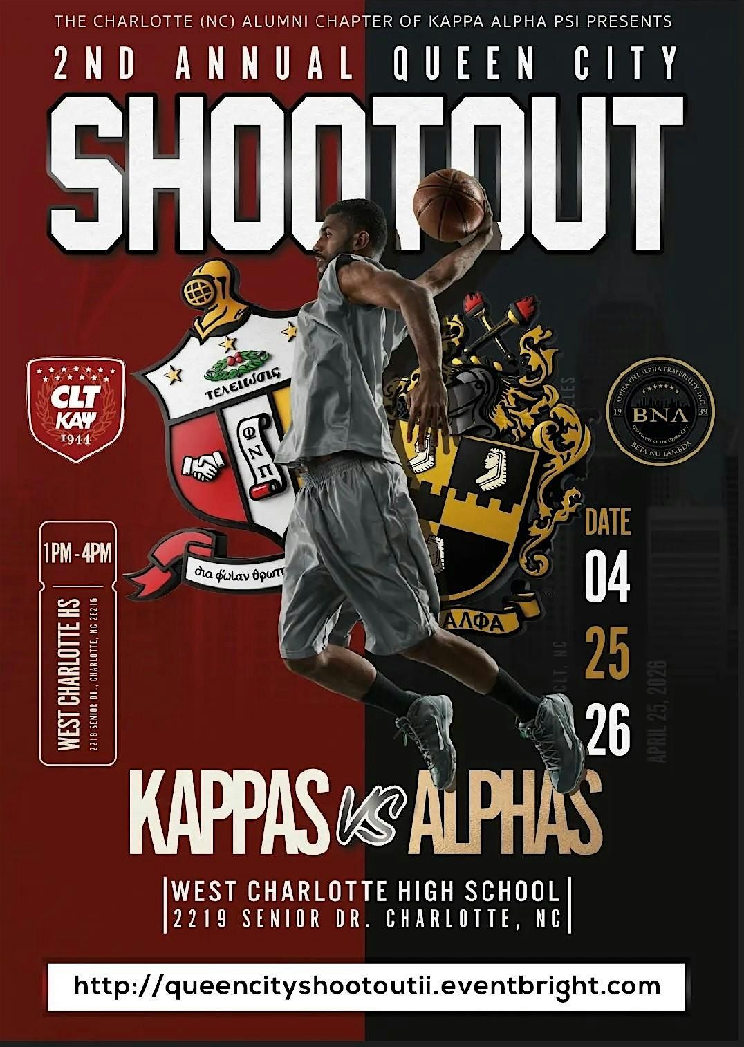 Come out Saturday, April 25th, 2026 at West Charlotte High School to watch the men of Kappa take on the men of Alpha in a battle for the Queen City Fraternity Crown.