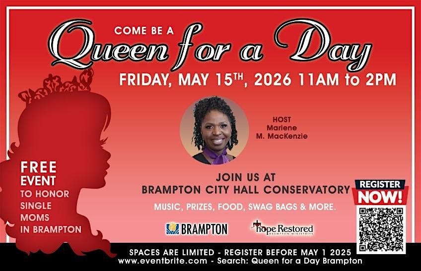 Queen for a Day is a heartwarming event designed to pamper, honor, and uplift single moms with children 18 years and younger living at home. This 4th annual celebration promises an extraordinary experience, featuring a warm welcome, a delicious complimentary lunch, a fabulous swag bag, exciting prizes, a royal photo, and delightful surprises throughout the day. You’ll also hear from our inspiring guest speaker, Candace Carter, who has triumphed over numerous challenges as a single mom and now works in the office of Mayor Patrick Brown. Don’t miss out on this empowering opportunity—RSVP now to secure your spot and be part of a day you'll cherish. Children aged 2 and under are more than welcome! hoperestoredbm.com