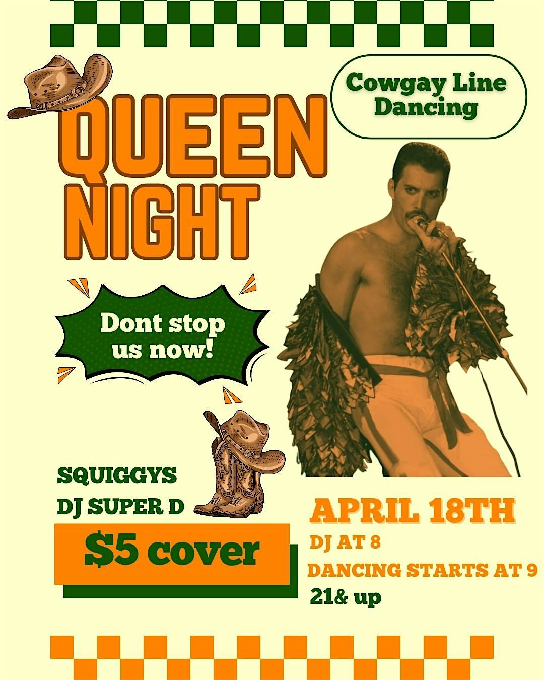 Get ready to dance the night away at Queen Night hosted by Cowgay Line Dancing! This in-person event is all about good vibes, great music, and awesome company. Whether you’re a line dance pro or just looking to try something new, come show off your moves or cheer on the crowd. $5 cover, cash only bar, 21&up event!