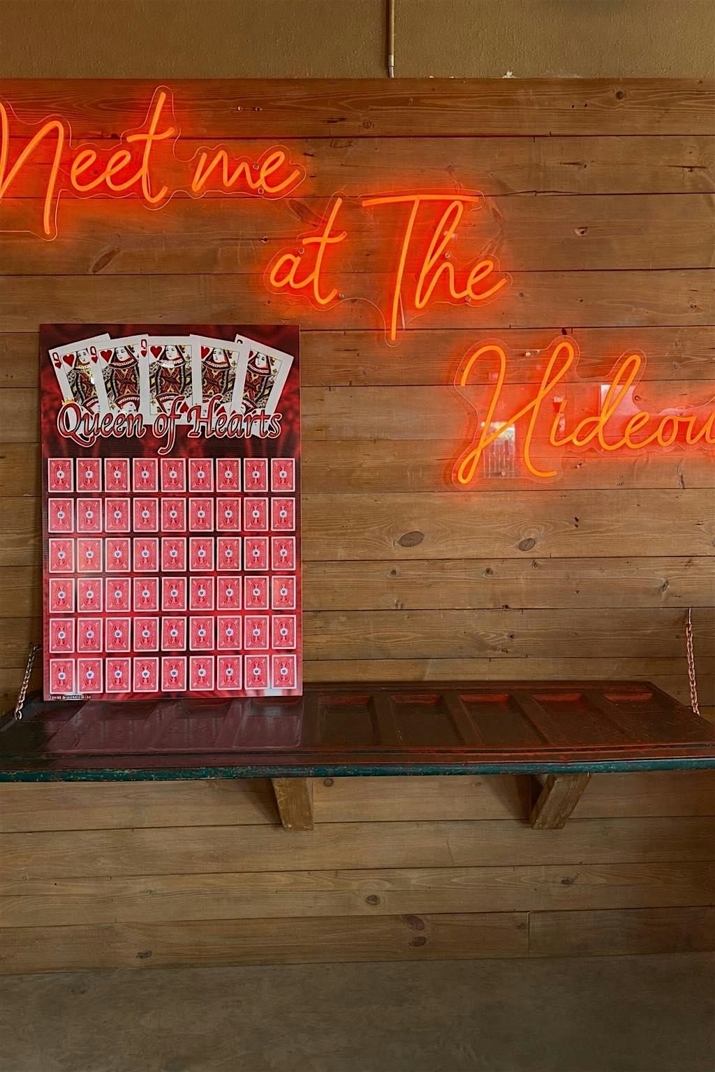 Get ready for a night packed with fun at the Queen of Hearts happening live at Texas Hideout! This in-person event is your chance to dive into some great vibes, meet cool people, and enjoy an unforgettable atmosphere. Tickets are $5 each or 5 for $20. Ticket pull is at 8:00 PM and you must be present to participate.