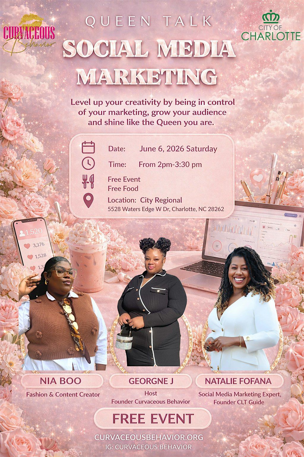 Are you an artist, creative, or entrepreneur ready to grow your brand? This is the room you need to be in. Join us on Saturday, June 6 from 2PM–3:30PM for an empowering Social Media Marketing experience featuring powerhouse speakers Nia Boo, a Fashion & Content Creator known for bringing brands to life through visual storytelling; Natalie Fofana, Social Media Marketing Expert and Founder of CLT Guide, helping businesses grow and scale their online presence; and your host Geornee J, Founder of Curvaceous Behavior Nonprofit, building platforms that empower creatives and community.