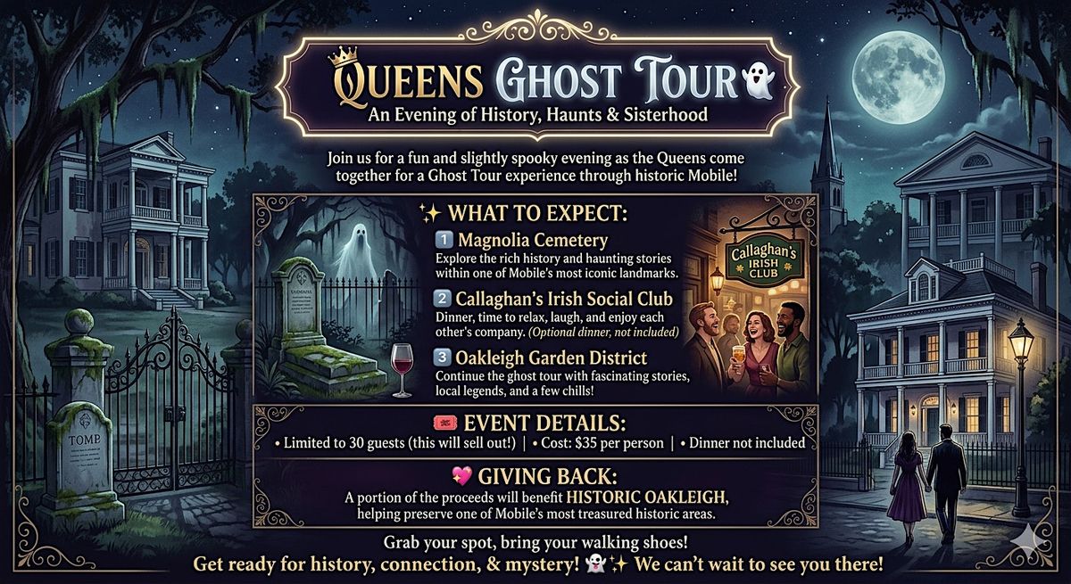 Then we’ll take a short walk to the beautiful and historic Oakleigh Garden District, where we’ll continue the second part of our ghost tour—filled with fascinating stories, local legends, and maybe a few chills along the way!